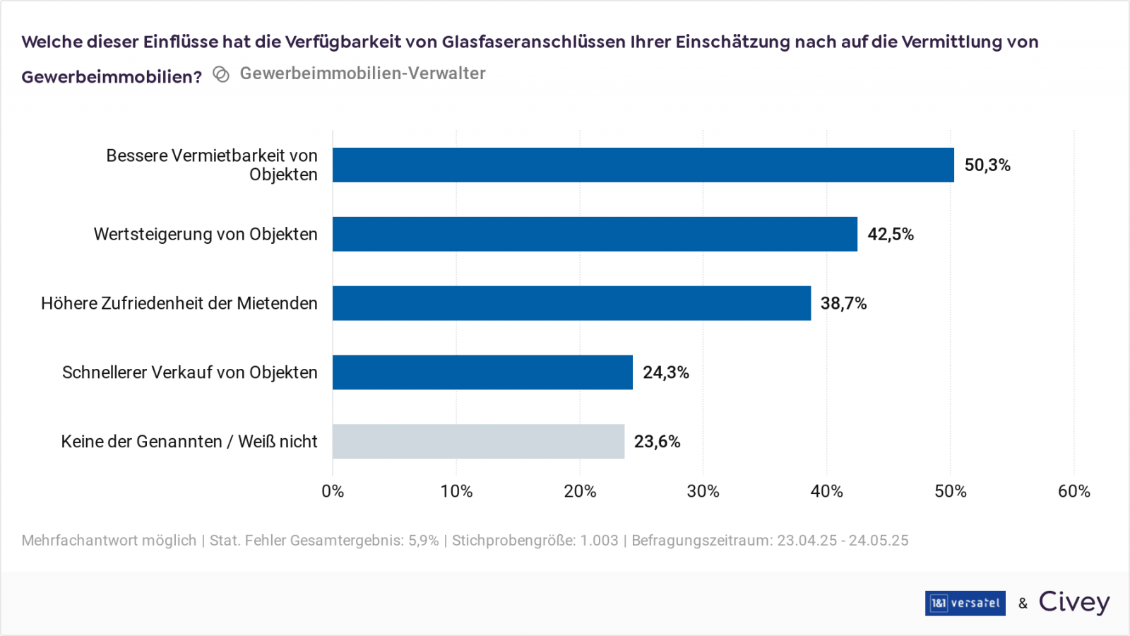 Wer in eine moderne digitale Infrastruktur investiert, macht Gewerbeimmobilien marktfähiger und zukunftsfähig. Die Ergebnisse unserer aktuellen Civey-Studie sind da eindeutig: Über 50 Prozent der befragten Immobilienprofis bestätigen, dass sich ein Glasfaseranschluss positiv auf die Vermietbarkeit auswirkt. Fast ebenso viele geben an, dass der Immobilienwert steigt. Und knapp ein Viertel sagt: Mit Glasfaser lassen sich Gewerbeobjekte schneller verkaufen.