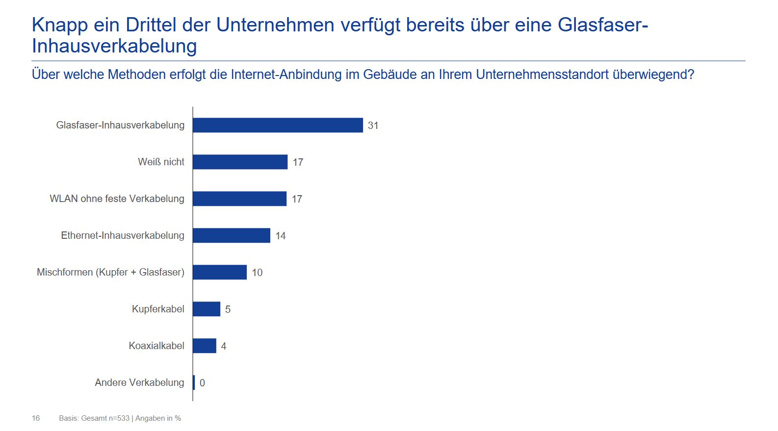 Immerhin will fast ein Viertel der Unternehmen in den kommenden zwei Jahren auf Glasfaser im Gebäude umsteigen, weitere 12 Prozent planen hybride Lösungen.